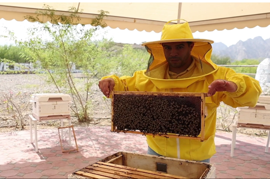 It’s not just local honey production or beekeeping on a largescale that the UAE is focused on. It is also a practice that the community is encouraged to adopt. Every morning, Moustafa Mohamed wears his beekeeping suit, thick gloves and a net covering his face, to check on hundreds of bee hives, lined with thousands of the fuzzy insects busy in different stages of honey production.